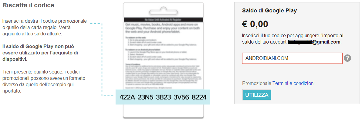 Potete riscattare il credito di un eventuale Gift Card in vostro possesso seguendo questo indirizzo, oppure scegliendo “utilizza” nella parte destra del Play Store.