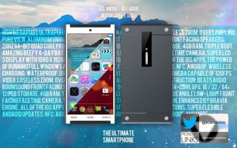 Il telefono è realizzato in policarbonato, vetro e metallo e può in “triple boot” avviare Android, Windows e iOS. Il device naturalmente inclue anche alcune specifiche da sogno tra cui un display da 4,5 pollici, 4GB di RAM, 20-megapixel fotocamera Pureview, 3000 mAh, e altoparlanti BoomSound. Sembra proprio un mix di tutti i migliori telefoni sul mercato in pratica.